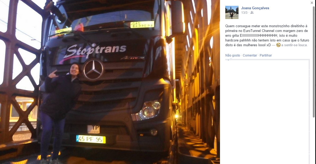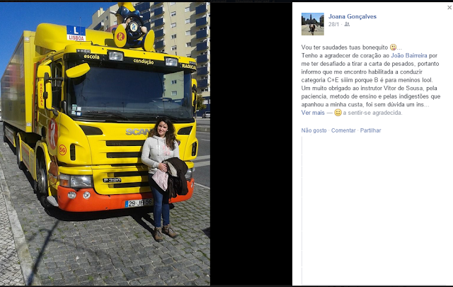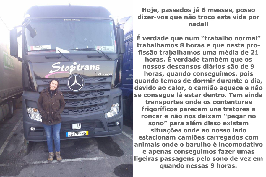 Ela é a JOANA e é CAMIONISTA! Sim, Camionista de Camiões mesmooo e daqueles grandes! ahahahah Conheço a Joana desde os meus 15 anos e descobri faz uns meses este lado aventureiro da miúda do secundário que almoçava comigo! Achei super curioso e pedi-lhe que nos contasse na primeira pessoa como é ser Camionista e sobretudo como é ser uma MULHER CAMIONISTA! Já agora, engane-se quem estiver a achar que a Joana é uma tipa super masculina e que fala grosso... ela para além de giríssima é super feminina! Nem quero imaginar as apitadelas que leva dos seus "colegas" de profissão! ahahah